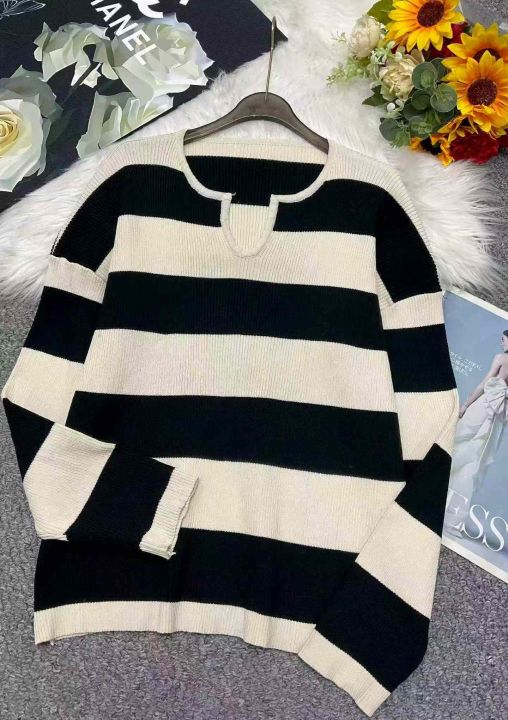 春季新款时尚洋气显瘦韩系撞色条纹宽松百搭套头毛衣,...