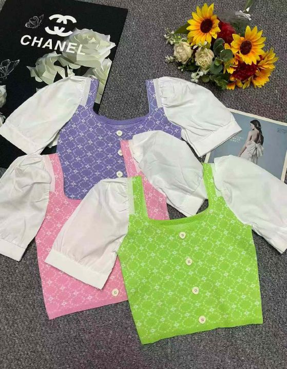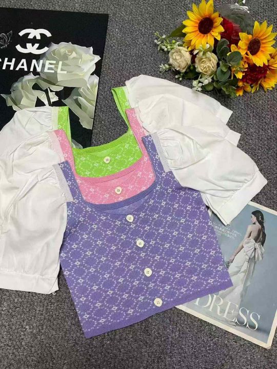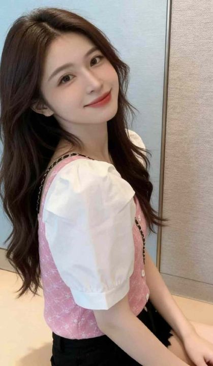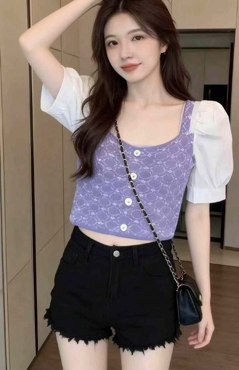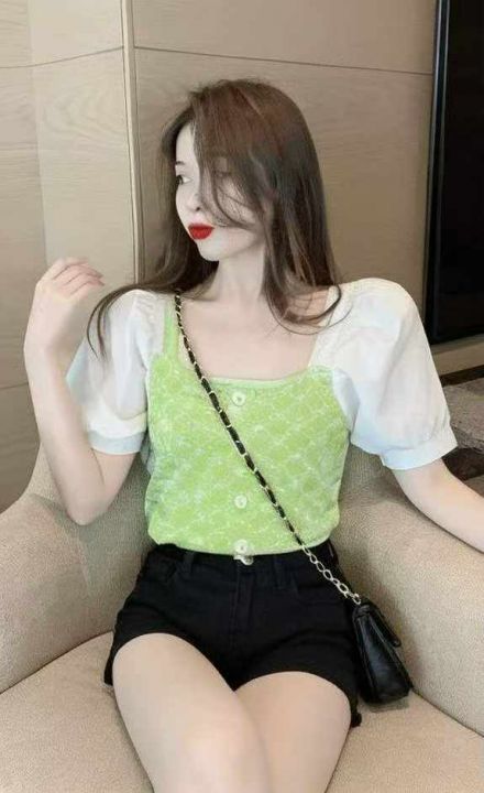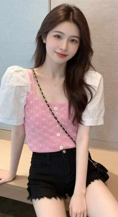夏季新款气质港味短袖拼接泡泡袖冰丝弹力修身方领针织小衫,独立包装,均码面料柔软有弹力,756件,全清5.9元超低价秒杀!分货加一!