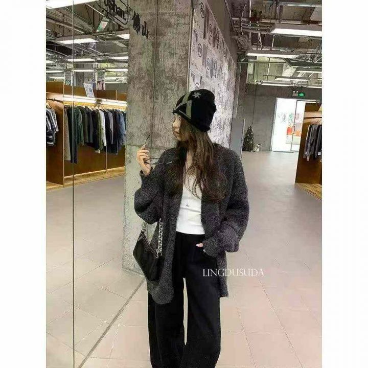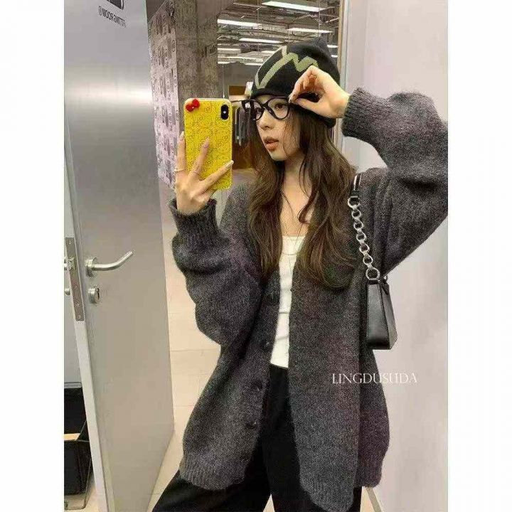 春秋新款宽松百搭v领纯色慵懒风毛衣开衫外套,独立包...