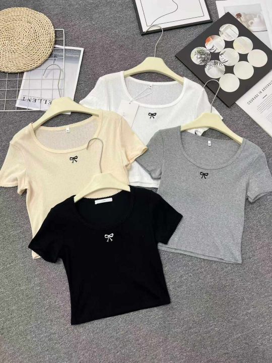 ☕️辣妹短袖T恤韩版百搭甜美提花蝴蝶结短款上衣580件全清8.8元 分货9.8元,码数SMLXL,单款4个色,棉高弹力,精品独立包装[庆祝][庆祝][庆祝]