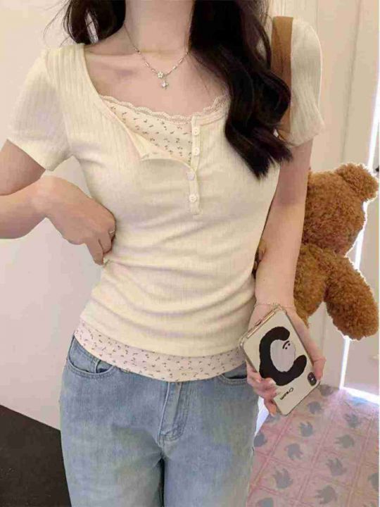 [月亮]:蕾丝花边假两件拼接碎花辣妹T恤