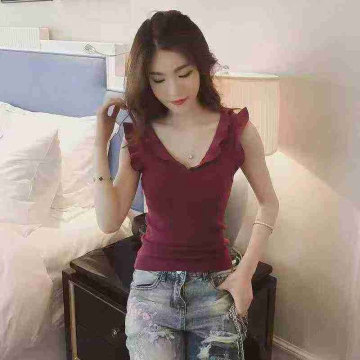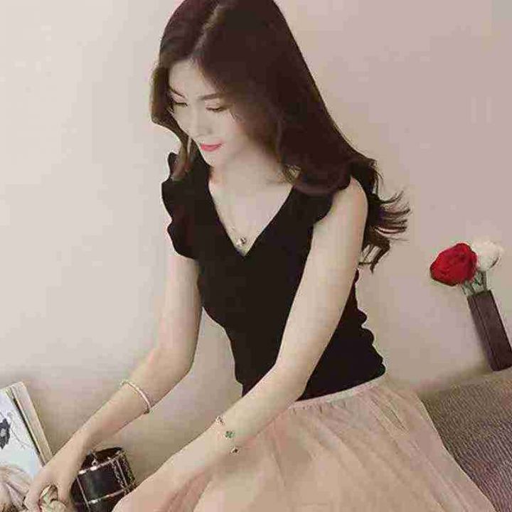 夏季韩版chic木耳边小飞袖修身显瘦气质v领针织衫上衣,独立包装,260件,清4.8