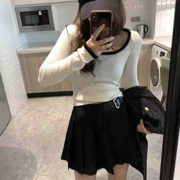 [月亮]:纯欲短款拼接方领辣妹德绒长袖上衣