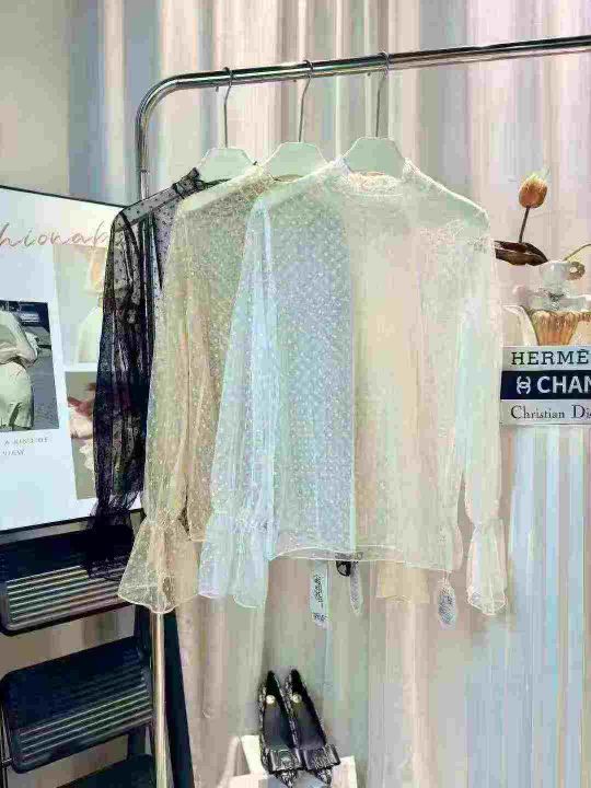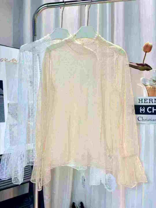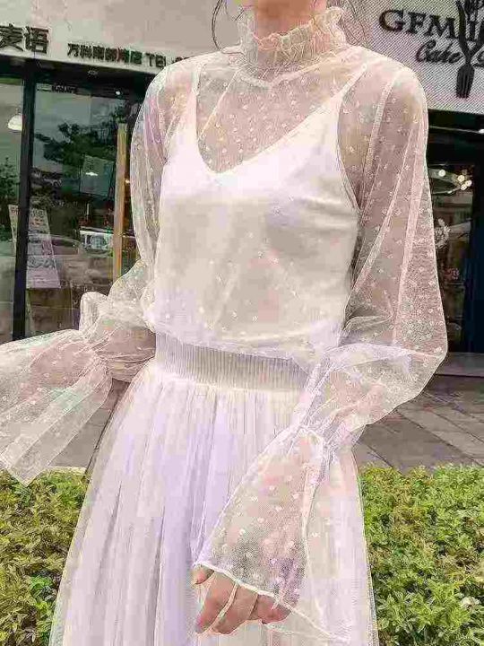 270件春装新款蕾丝波点网纱打底衫女内搭超仙喇叭袖纱...