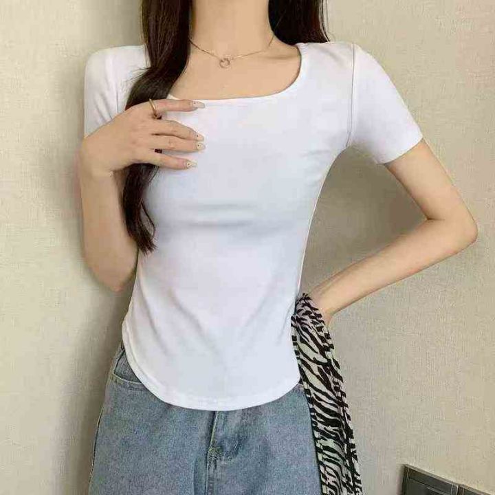 冰丝螺纹纯色U领下摆短袖 356件,全清5.8元,正品独立包装,四个色,码数:M到XL,弧形下摆U领正肩短袖T恤女夏季简约修身显瘦上衣