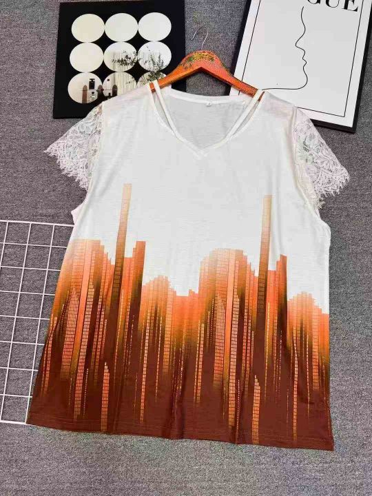 721件,夏季新款欧美女装V领蕾丝渐变个性印花宽松短袖T恤女,独立包装\'码数S-5XL,分货➕1,货号001#30