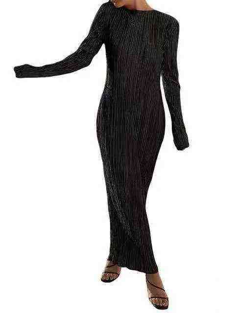春季新款品牌外贸原单美式三宅弹力褶皱大长款连衣裙,...