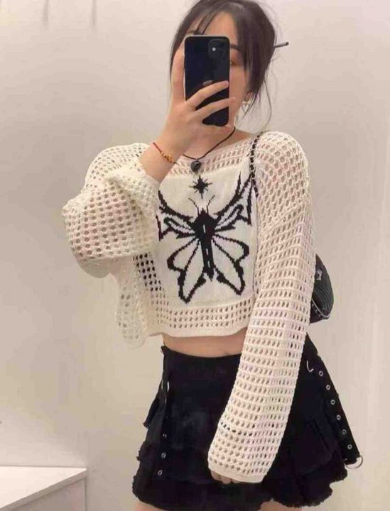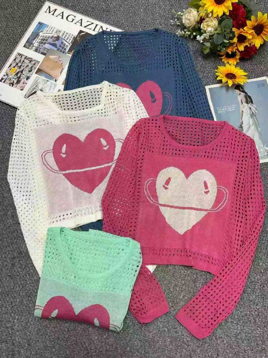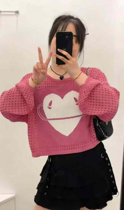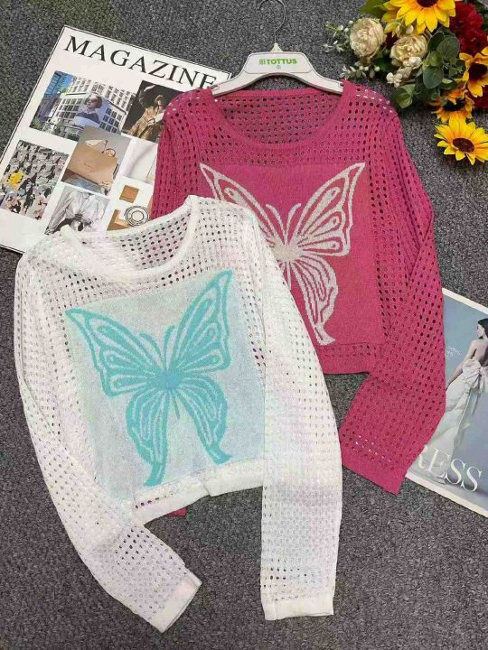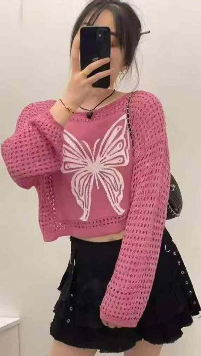 春夏新款美式辣妹镂空高级感印花撞色防晒针织罩衫,独...