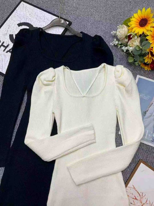 捡漏款,春季新款弹力修身韩系方领泡泡袖气质纯欲风修...