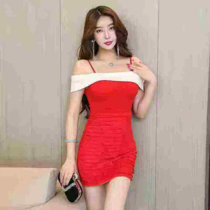 74条韩版一字肩性感吊带晚礼服包臀短款低胸气质高端名媛拼色连衣裙显瘦,尺码M-3XL,没带胸垫,做工品质好,福利秒杀价6.8 不分货