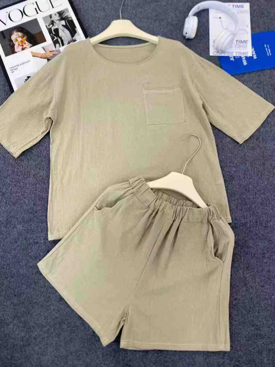 棉麻女士套装 98套,全清 10.8元,独立包装,单款三色,码数;1-3-5(M到XL),设计感简约风圆领短袖套装女2026夏季大码胖MM显瘦T恤短裤两件套