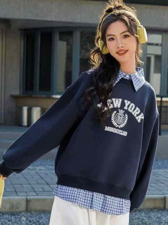 格子拼接假两件新款卫衣少女春秋季初中高中学生宽松洋气,纯棉毛圈,独立包...
