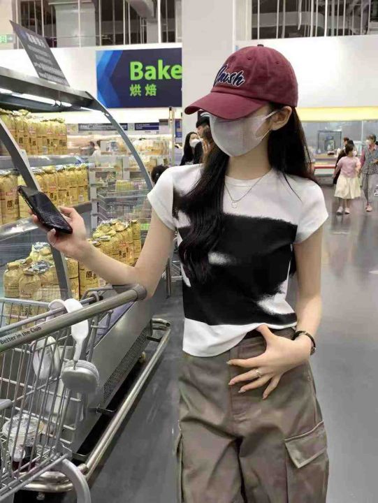 ☕️辣妹撞色白色小飞袖正肩短袖t恤女夏季纯棉修身显...