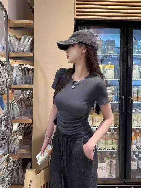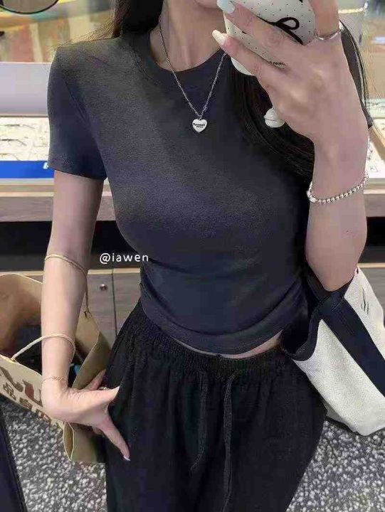☕️纯棉辣妹短款褶皱收腰短袖T恤女修身显瘦露腰正肩...