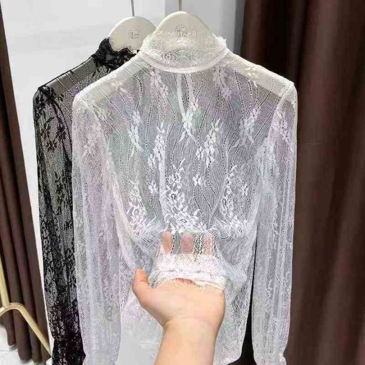 270件半高领白色蕾丝网纱打底衫内搭叠穿绝美花边透明上衣女轻奢高级感,质...