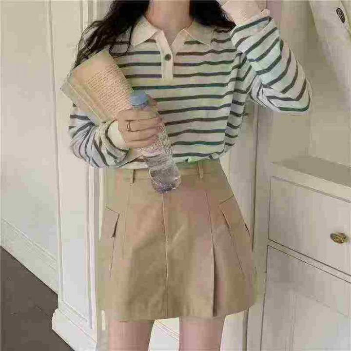 1150件早秋新款韩系宽松高级感撞色条纹百搭POLO领长袖针织毛衣,独立包装,...