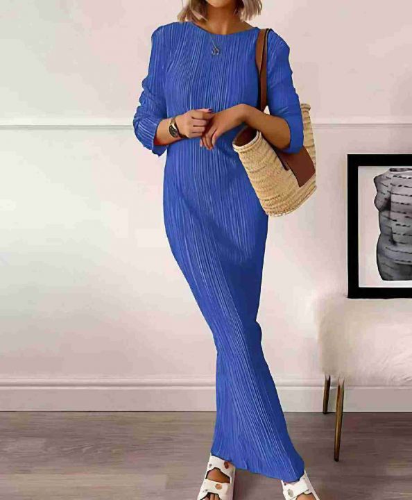 春季新款品牌外贸原单美式三宅弹力褶皱大长款连衣裙,...
