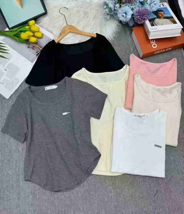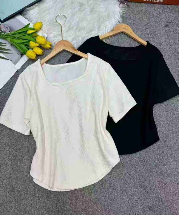 新款不规则短袖复古气质圆领修身弧形下摆螺纹T恤女,整款4色,有后领包边,...