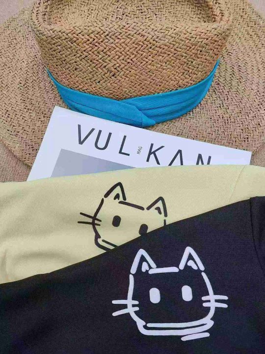 [月亮]:夏季正肩V领猫咪印花短袖T恤