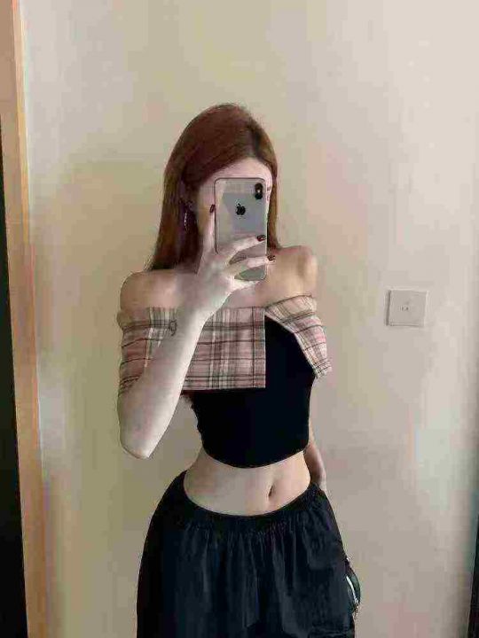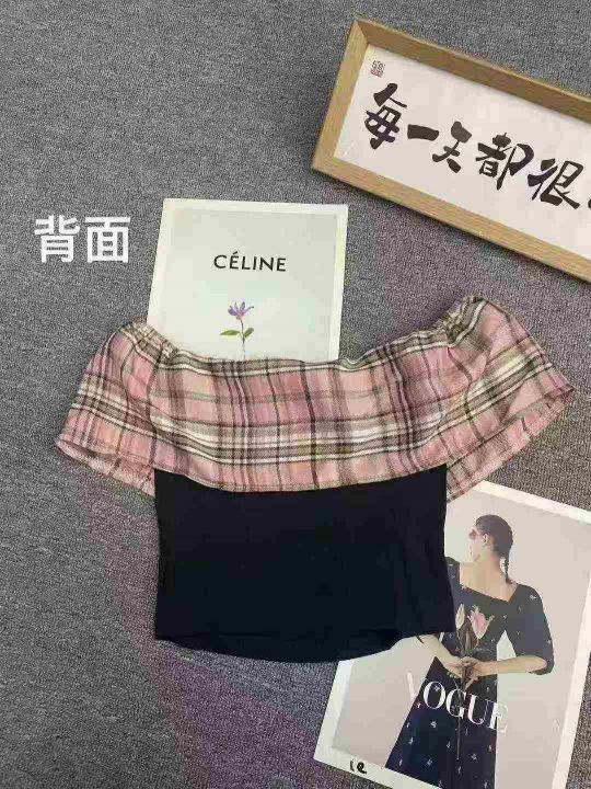 复古格纹一字肩短袖64件7.5,面料舒适透气,有弹力,...