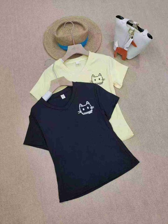 [月亮]:夏季正肩V领猫咪印花短袖T恤