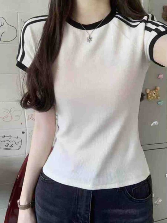 ☕️纯棉美式国潮设计感三条杠修身短袖t恤女夏季新款简约基础款上衣1500件...