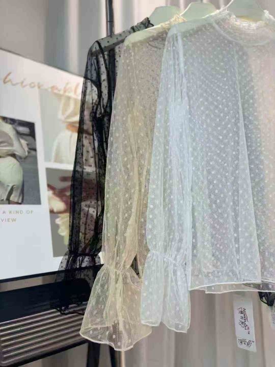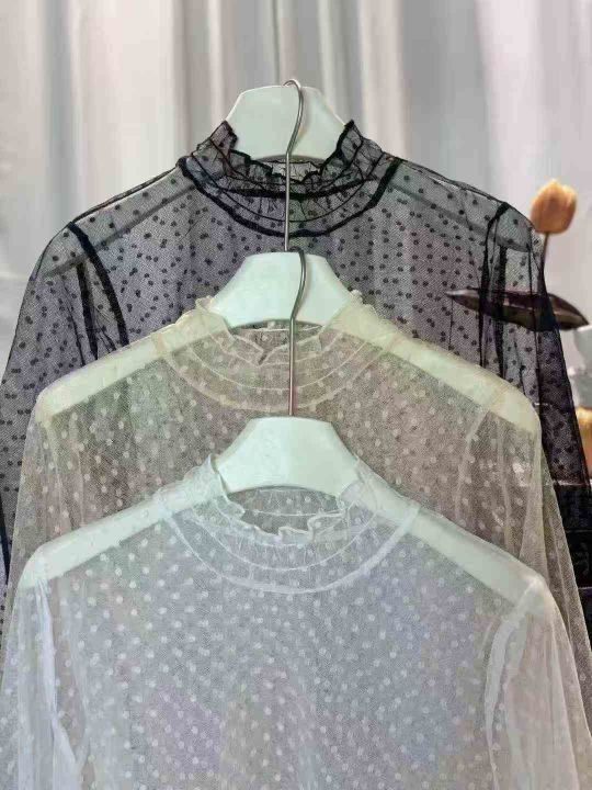 270件春装新款蕾丝波点网纱打底衫女内搭超仙喇叭袖纱衣半高领上衣,水溶蕾丝高弹力不易勾丝,质量超好,尺码S-3XL,独立拉链包装,零瑕疵,福利秒杀价4.9