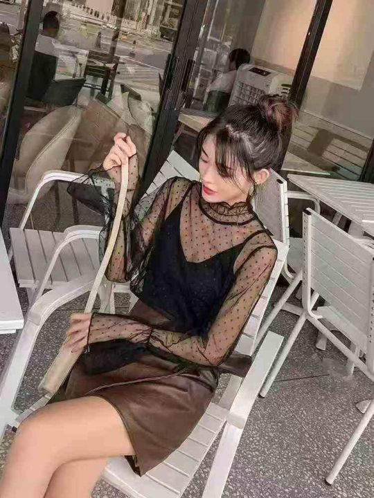 270件春装新款蕾丝波点网纱打底衫女内搭超仙喇叭袖纱...