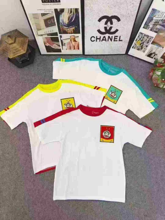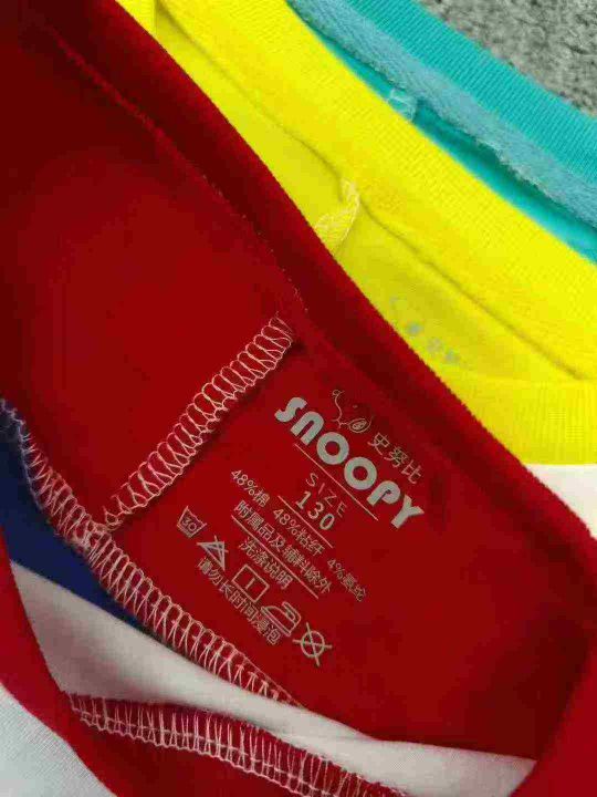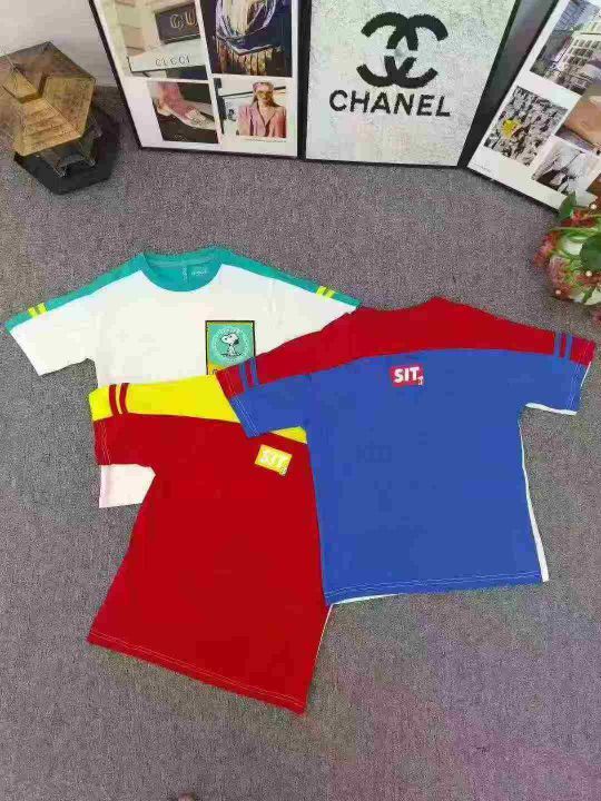 品牌童装拼色T恤 数量2200件左右 尺码110--160 整款三个色 后领包边 面料图7 可分品牌出, 独立包装带吊牌 大货干净整齐