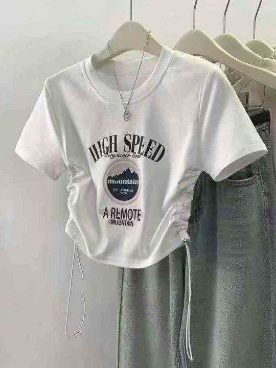 20000件全清11.8元,200件起12.8元,均码高弹力80-130斤,美式复古抽绳正肩短袖t恤女夏季设计感收腰修身辣妹短款上衣