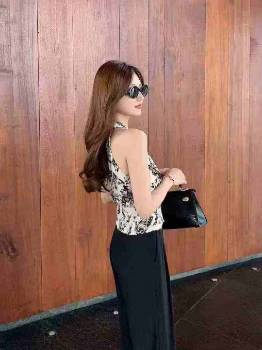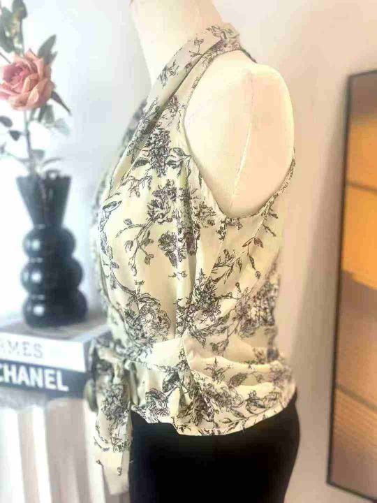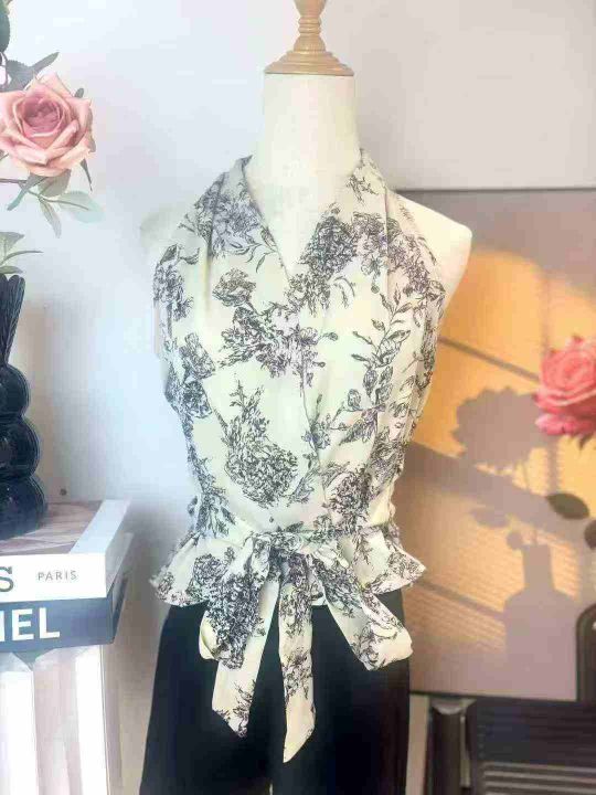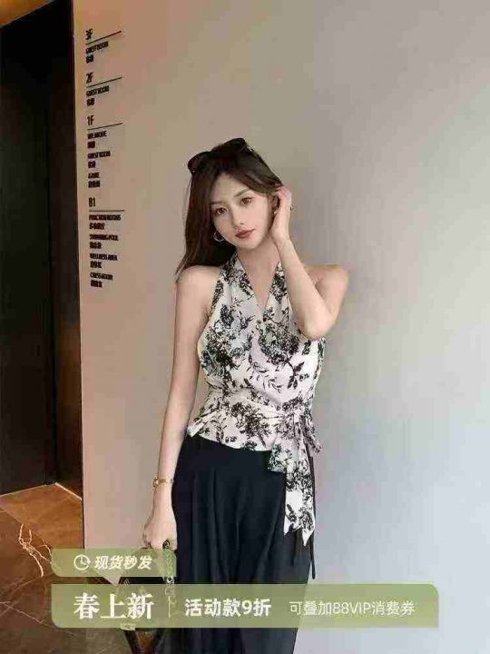 87件法式系带雪纺印花无袖挂脖背心上衣女夏轻熟法式小众高级感短款小衫,尺码S-L,独立包装!福利秒杀价5.9 不分货