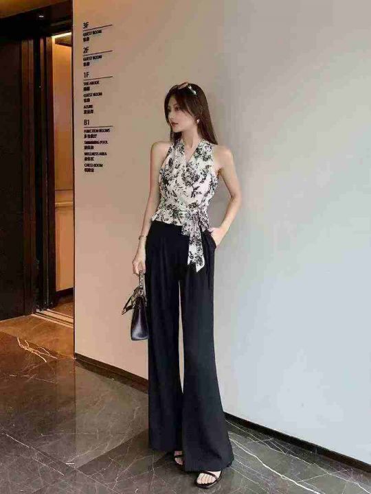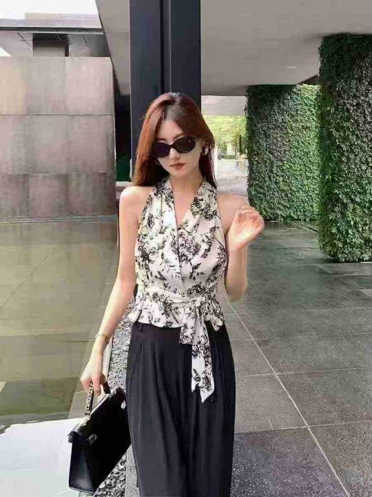 87件法式系带雪纺印花无袖挂脖背心上衣女夏轻熟法式小众高级感短款小衫,尺码S-L,独立包装!福利秒杀价5.9 不分货
