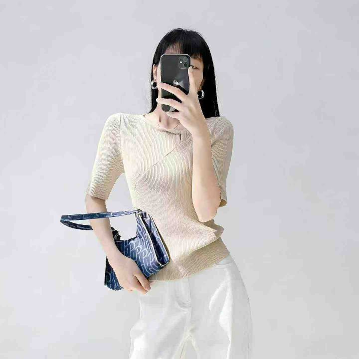 圆领抽褶不规则领口套头短袖针织衫,独立包装,190件,清5.8,分➕0.5...