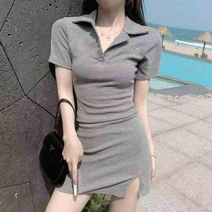 全清6.9polo领连衣裙 纯欲辣妹修身显瘦性感开叉短袖包...