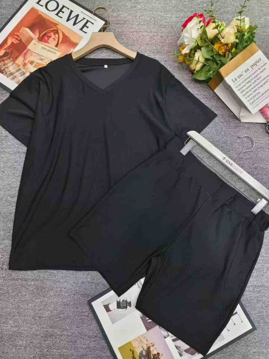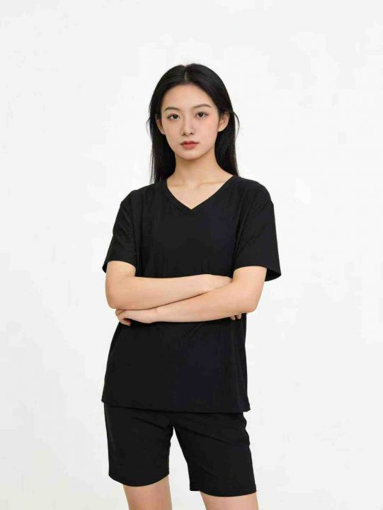 电商仓回收163套黑色净版v领显瘦纯色宽松女士短袖短裤套装,码数S-4XL。面料柔软有弹力,独立包装,分货➕0.5
