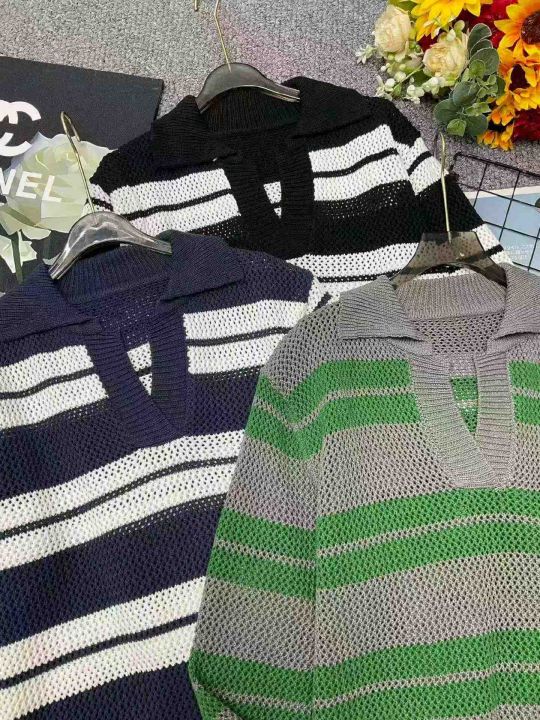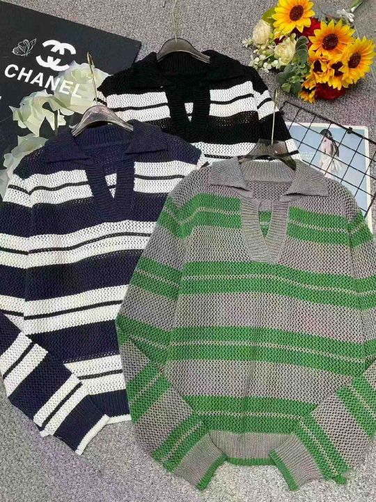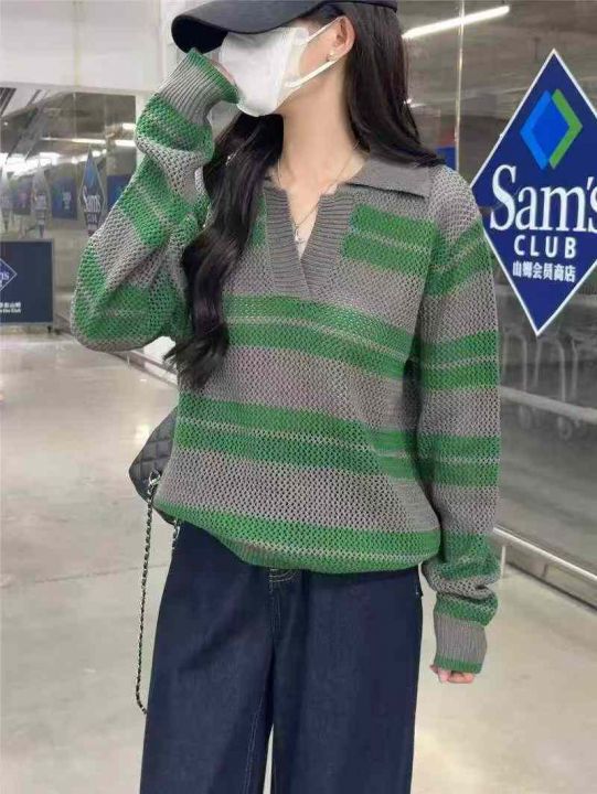 明星同款韩版宽松百搭撞色镂空套头polo领条纹毛衣,独...