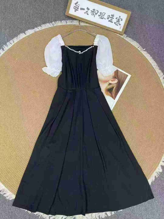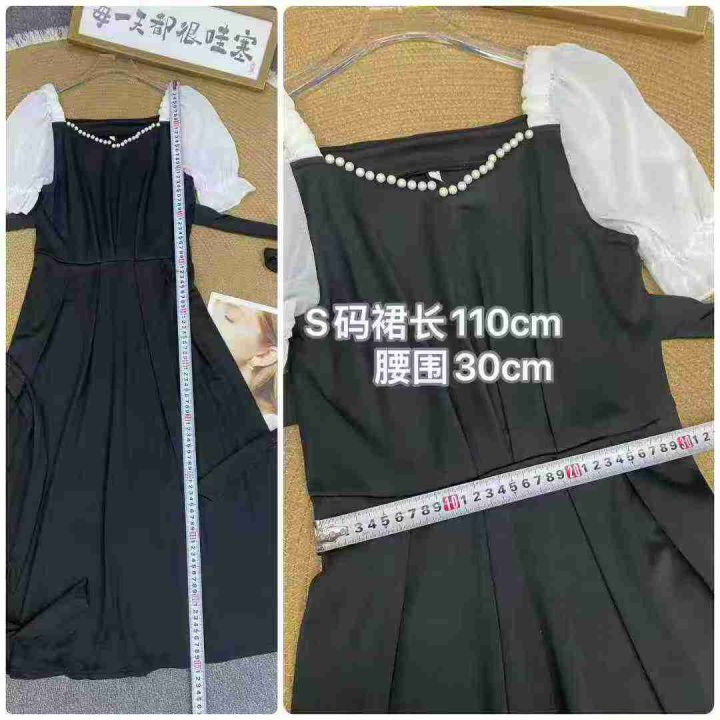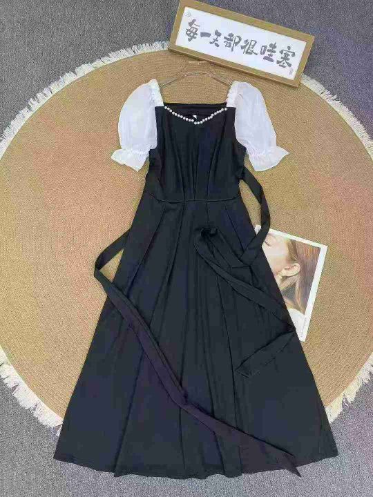 法式泡泡袖连衣裙80件6.8,撞色拼接,珍珠装饰,绑带...