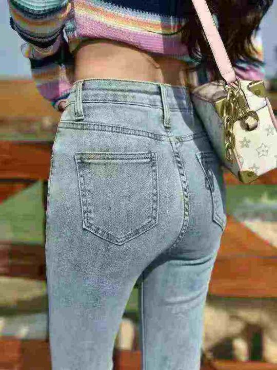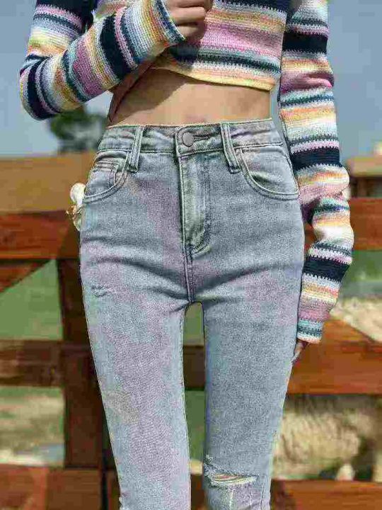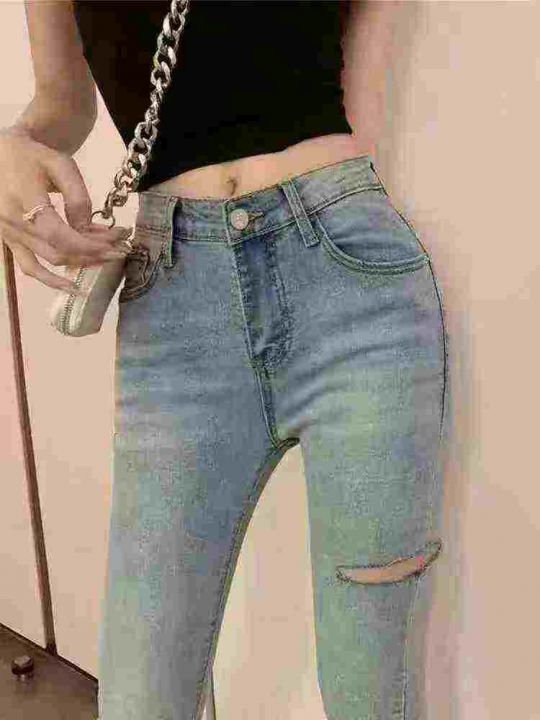 破洞牛仔裤子女高腰紧身弹力小个子显瘦毛边小脚裤210...