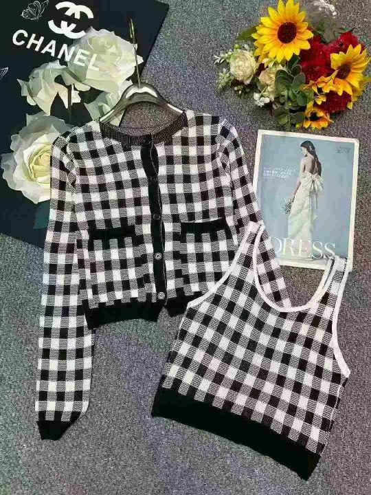 139套小香风棋盘格针织毛衣开衫+针织吊带背心2件套,独立包装,均码