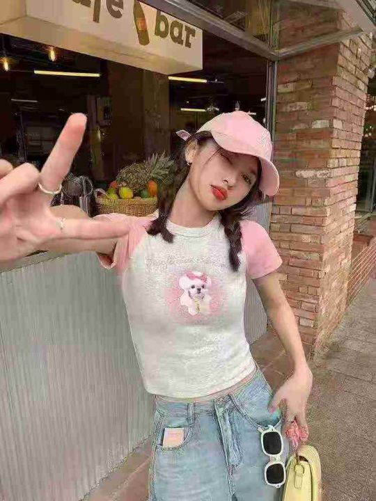 [月亮]:撞色小狗图案棉质辣妹T恤