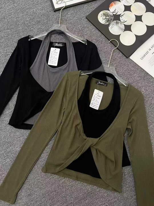 ☕️大整款辣妹长袖4600件全清6.8元 ,分货7.8元,S到XL,单款2色,高弹力,独立包装吊牌,设计感假两件挂脖上衣女早秋辣妹修身显瘦短款露肩撞色长袖T恤