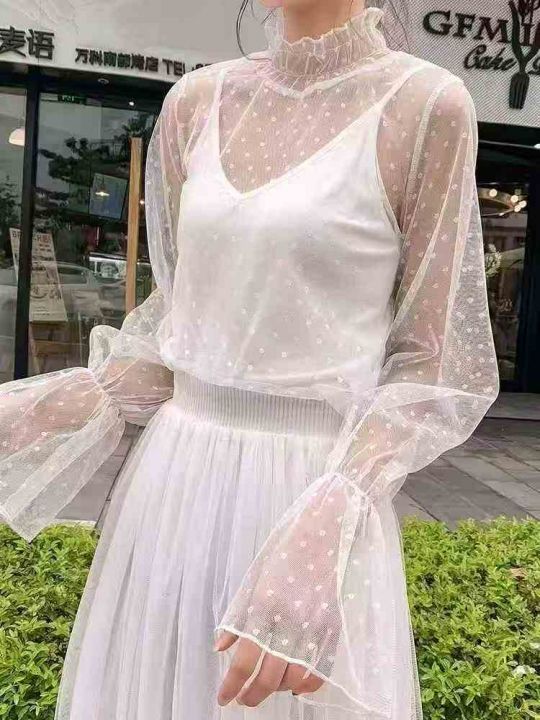 270件春装新款蕾丝波点网纱打底衫女内搭超仙喇叭袖纱衣半高领上衣,水溶蕾...
