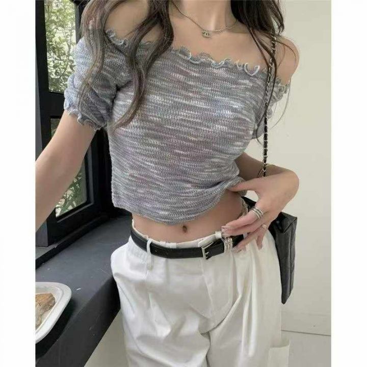 夏季新款段染彩纱木耳边性感辣妹针织短袖t恤,独立包装,均码面料柔软舒适...