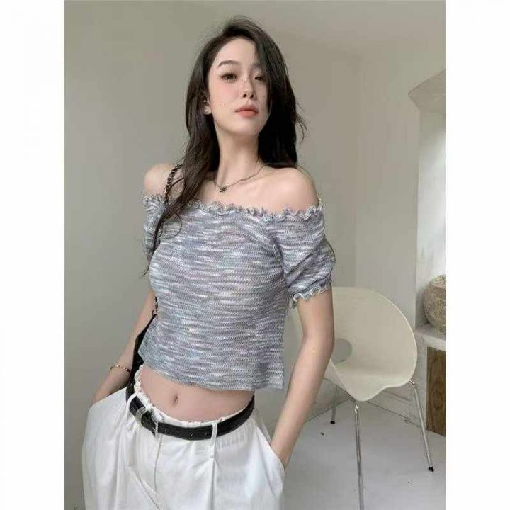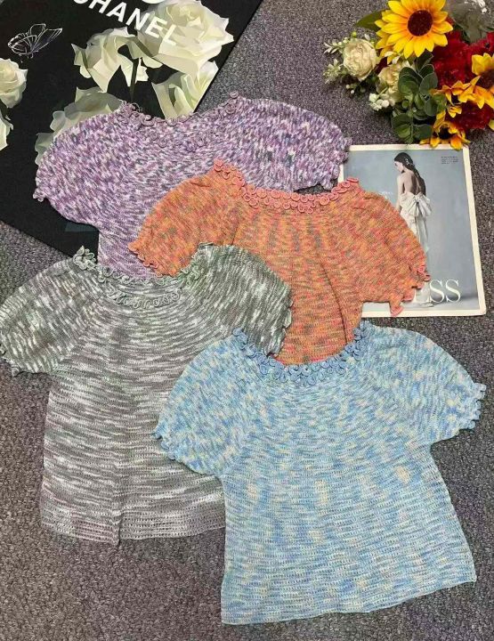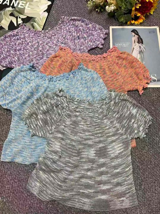 夏季新款段染彩纱木耳边性感辣妹针织短袖t恤,独立包装,均码面料柔软舒适弹力大,1400件,全清4.9元超低价秒杀!分货加一!