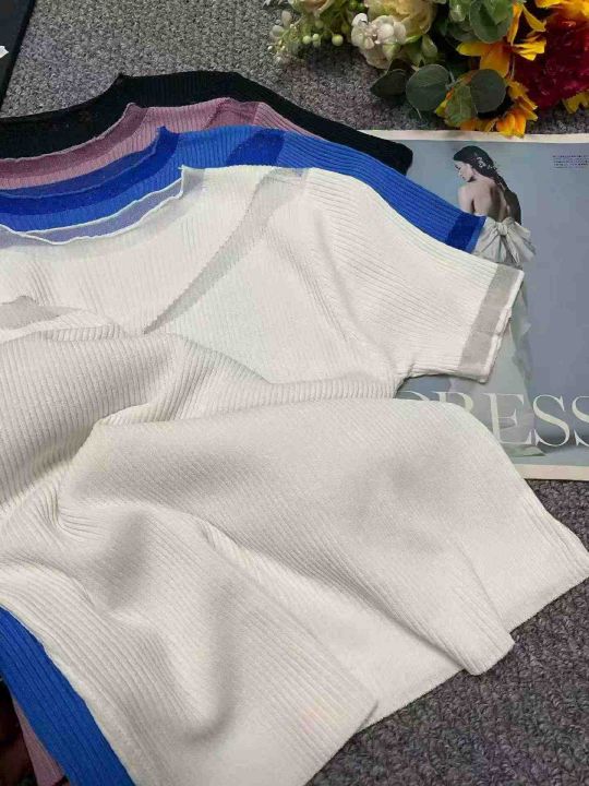 夏季新款蕾丝拼接弹力修身显瘦短袖针织衫,独立包装,...