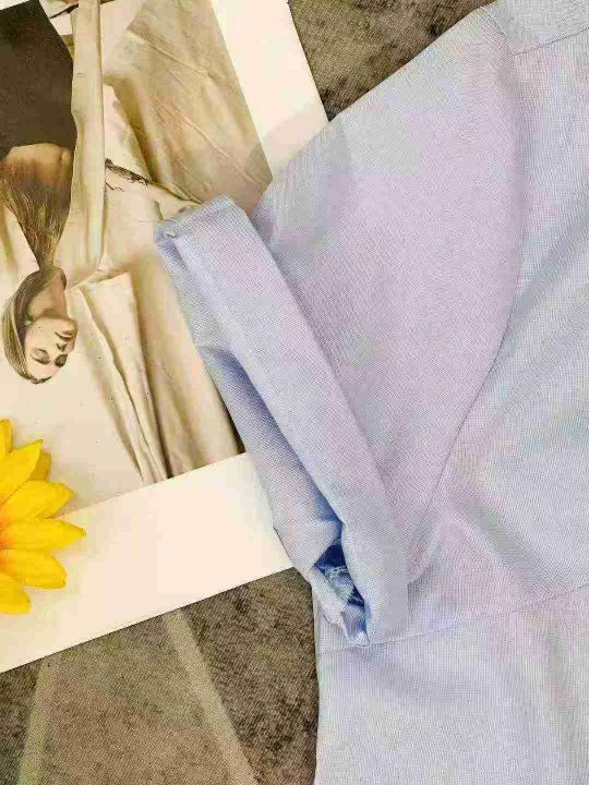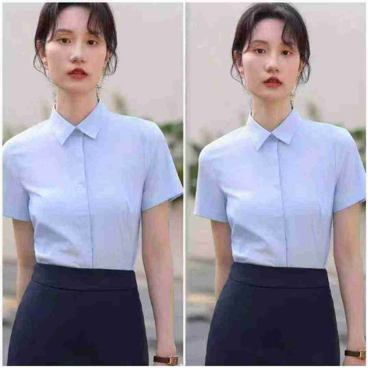 蓝色职业衬衫女短袖修身工作服公务员面试工装正装衬衣,淡蓝色温柔可亲[色],面料舒适透气,基础款️单穿️叠穿,轻松百搭,轻薄面料设计感更加分[哇],修身设计藏肉显瘦,超有性价比,分货9.9