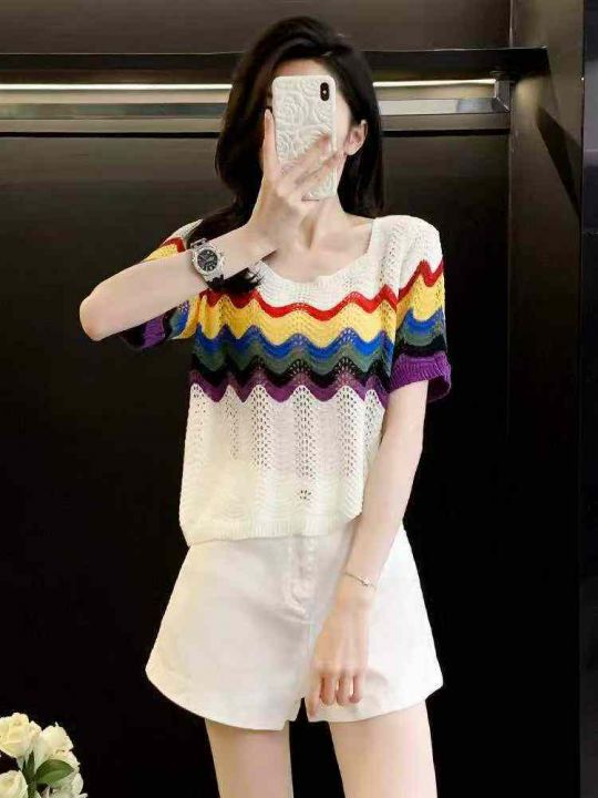 夏季新款彩虹条纹镂空冰丝宽松洋气减龄短款短袖针织小...