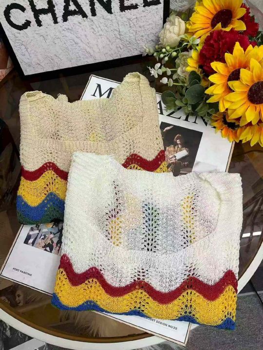 夏季新款彩虹条纹镂空冰丝宽松洋气减龄短款短袖针织小衫,独立包装,均码面料柔软舒适宽松版,860件,全清6.9元超低价秒杀!分货加一!