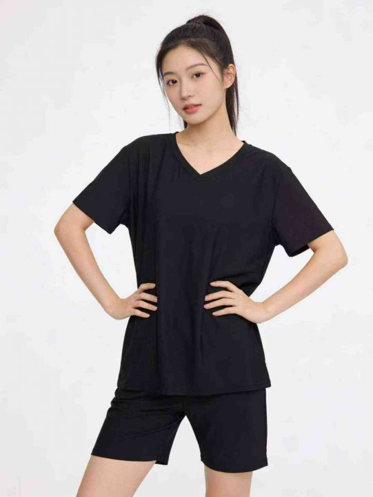 4.9清电商仓回收163套黑色净版v领显瘦纯色宽松女士短袖短裤套装,码数S-4XL...