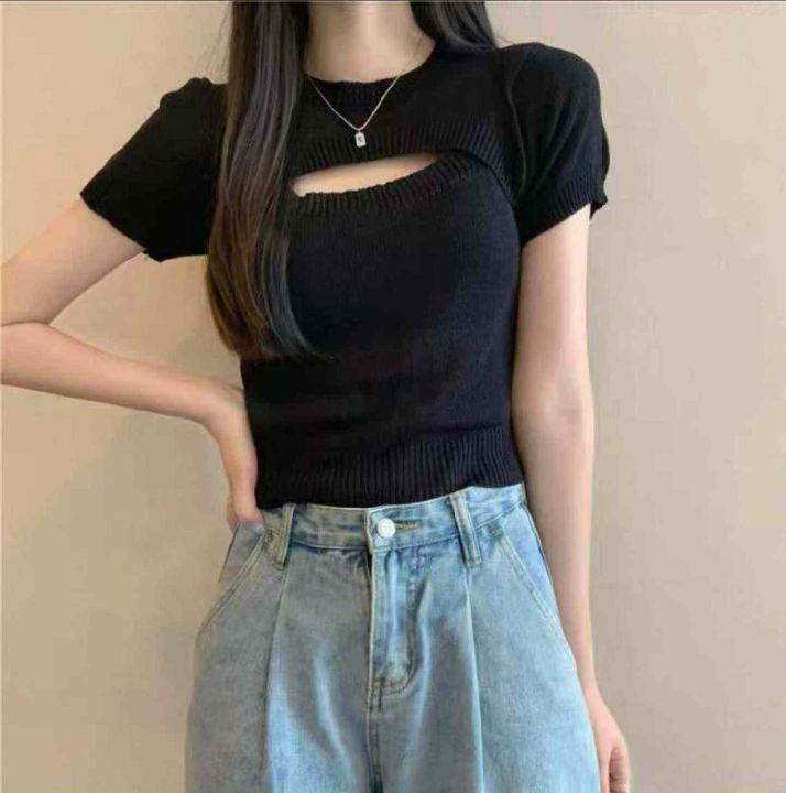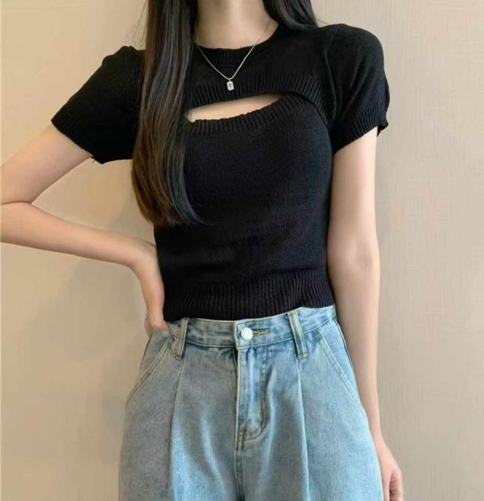 夏季新款不规则镂空正肩辣妹冰丝针织短袖小衫,独立包...